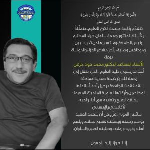 لابد أن نكتب شيئأ عن الدكتور محمد جواد خزعل الزبيدي الذي يعمل في قسم الأدلة الجنائية كلية العلوم ذات الأختصاص النادر قتله غدر المرض المفاجئ؟نـــــم قـــرير العين مرتاح البال..أنرت طريق الشهادة..لقد أبكيت القريب والبعيد ان الدكتور محمد الزبيدي أسم كان يندرج ضمن قائمة الأطباء في الأدلة الجنائية ينتظر دوره من أجل تقديم الخدمات لعامة الناس دون كلل أو ملل حتى منتسبو الأدلة الجنائية يتأملون وعيونهم تتجه صوب طبيبهم يوميا منذ الصباح الباكر،يبتسم عند لقائهم،لكن اليوم كيف يلتقيكم بعد ان غيبهو عنفوان الموت المفاجئ. انتقل الى ملائكة الرحمن تزفه بدمه الطاهر الى الجنان..لكن ماذا نقول لأمه وذويه منهم الأشقاء المهندس حسين والدكتور سجاد والمهندس بلال وهم عيونهم تتطلع الى شهيد الأنسانية كيف نصارحهم بما حصل..أيها الأحبة تنتظرون متى يعود اليكم هل من موعد اللقاء أم هذه لحظات الوداع..لقد نلت طلب القداسة برضى من الله عز وجل..روحك الطاهرة أضاءت سماءنا في حالكات الليلة الحمراء..زهقتها خطف روحك الطاهرة..نعم لقد ضربت اروع الأمثال بالكرم والشهامة والان ذهبت الى رب عظيم يحب الشهداء وعلى الوصف انك اكرم منا جميعا سيبقى الشهداء صناع المجد والنصر..أنتم السابقون ونحن اللاحقون بإذن الله؟